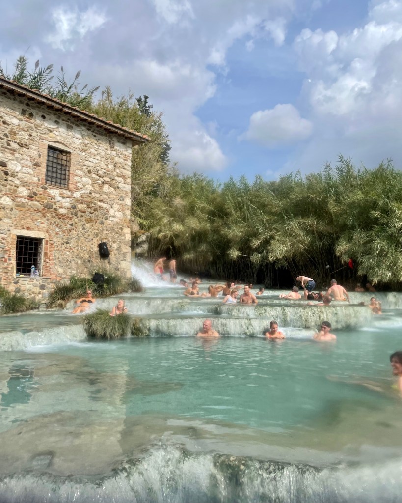 Nearby, the Tuscan hot springs provide one of the most memorable natural experiences of the trip. Saturnia’s pale blue cascades, best visited at sunrise, create the feeling of bathing inside a painting.